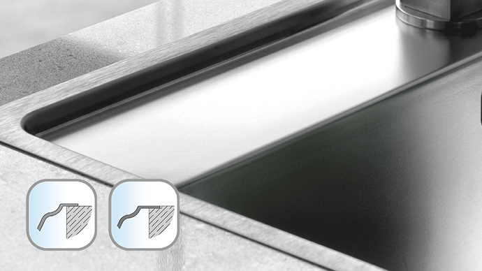 Klasično rešenje. Kod standardne ugradnje rub je izbočen, pa daje sudoperi dodatnu stabilnost. Sudopera je fiksirana u otvoru radne ploče, koja može biti izrađena od bilo kog materijala. Rub standard je debljine 6 mm.